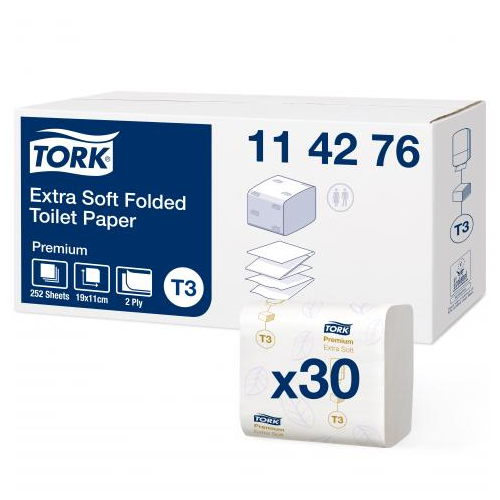 System dozowania Tork Folded miękkiego papieru toaletowego w składce zapewnia higieniczne dozowanie pojedynczych odcinków, które ogranicza odpadki i koszt konserwacji. Tork ekstra miękki papier toaletowy w składce zapewnia wyjątkowy wygląd, miękkość i wydajność. System idealnie sprawdzi się w łazienkach o średnim natężeniu ruchu, zwłaszcza w służbie zdrowia oraz branży HoReCa.
