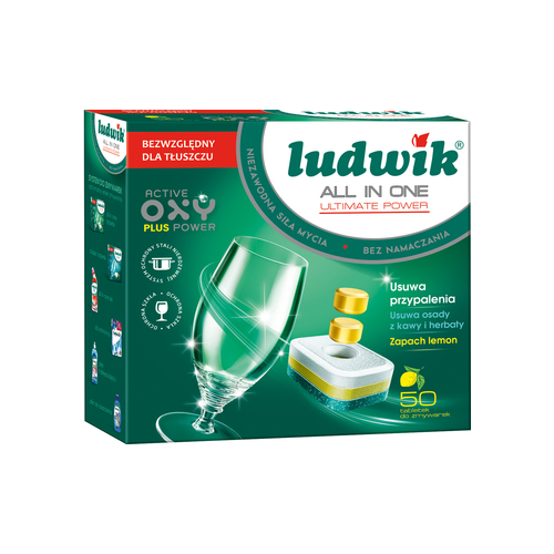 LUDWIK ALL IN ONE tabletki do zmywarek posiadaja innowacyjna formułe Active Oxy Power Plus, która dzieki kompleksowemu działaniu srodków alkalicznych, enzymów i aktywnego tlenu bezwzglednie walczy z tłuszczem i przypaleniami. Efektywnie usuwa nawet najbardziej uporczywe zabrudzenia bez koniecznosci namaczania, nadaje połysk. Zawarte w formule specjalne substancje zapobiegaja matowieniu oraz korozji szkła i stali nierdzewnej.
